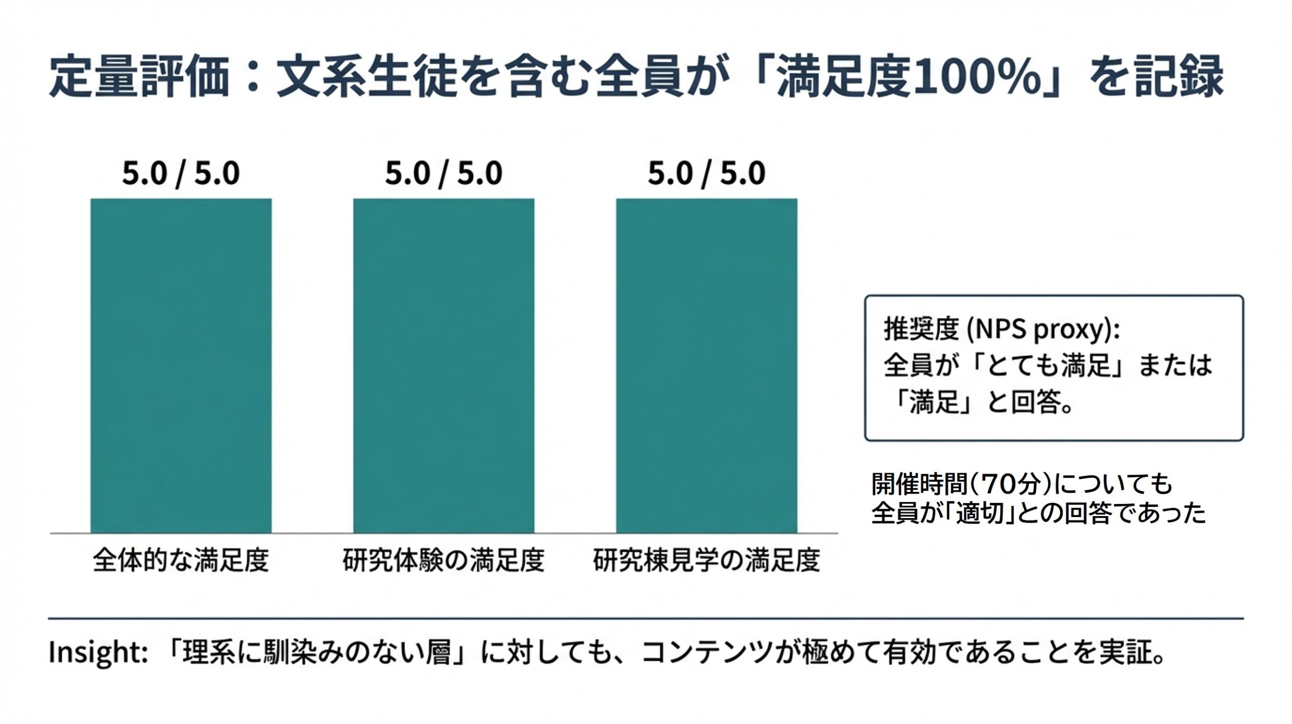 アンケートの結果、参加者の満足度は100%(全員が『とても満足』または『満足』と回答)という極めて高い評価をいただきました