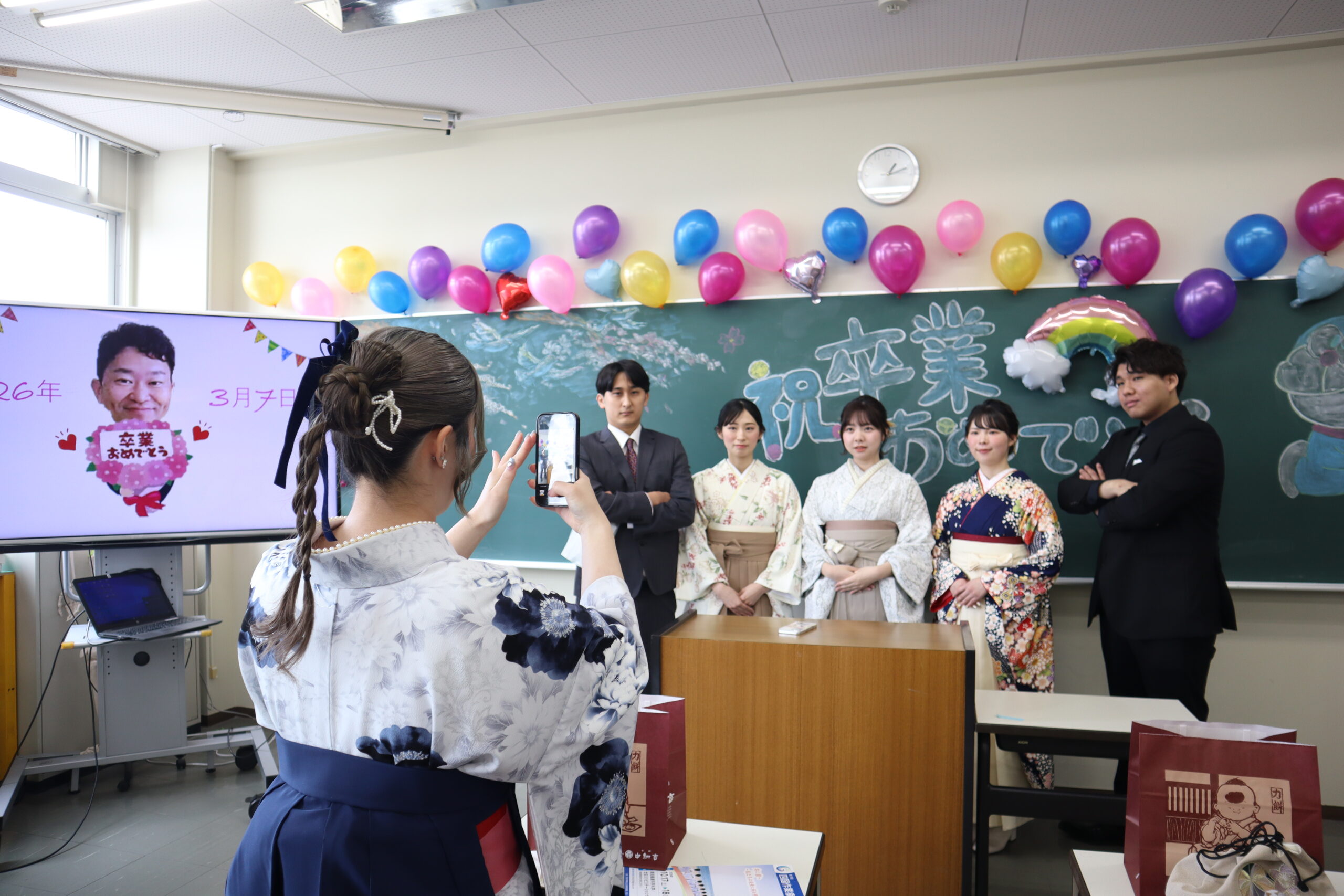 式典の前後では、ゼミ教員にプレゼントを渡したり保護者や友人と写真を撮るなど、最後の時を惜しむ姿があちこちで見られました。