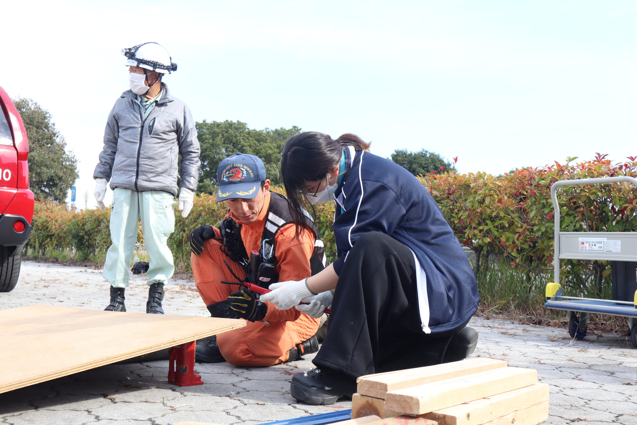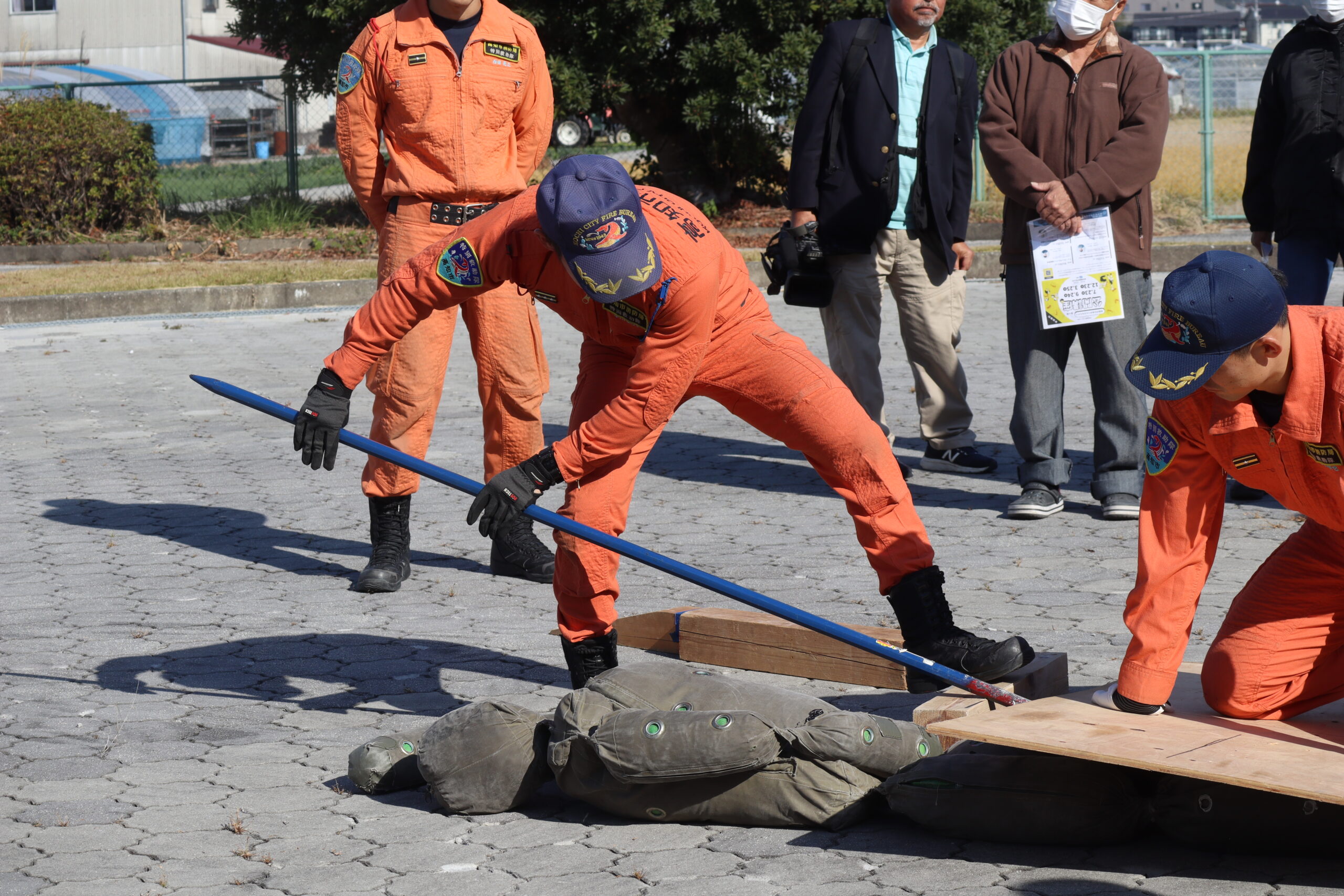 図書館前の広場では、バールやジャッキを使った救助訓練を実施。